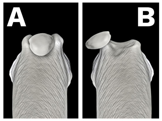 髕骨脫位偶爾是由於膝蓋受到創傷而引起的,導致肢體突然嚴重跛行。然而,大多數狗的確切病因仍不清楚,但可能是由多種因素造成的。對於非創傷性髕骨脫位的狗來說,膝蓋骨通常所在的股骨溝通常很淺(圖 2a、圖 2b)或不存在。在沒有創傷和品種易感性的情況下對雙側疾病進行早期診斷,支持了以下觀點:髕骨脫位是由於整個伸肌裝置的先天性或發育性錯位造成的。因此,發育性髕骨脫位不再被視為一種孤立的膝關節疾病,而是影響肢體整體排列的複雜骨骼異常的結果,包括: