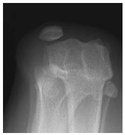 <圖 2a:術前膝關節 X 光(天際線)圖:股骨溝較淺,膝蓋骨位於股骨溝外側。>