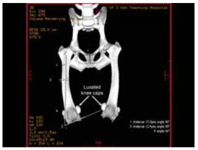 <圖 3:雙膝髕骨嚴重脫位且股骨畸形(彎曲)的狗進行術前電腦斷層掃描 。>